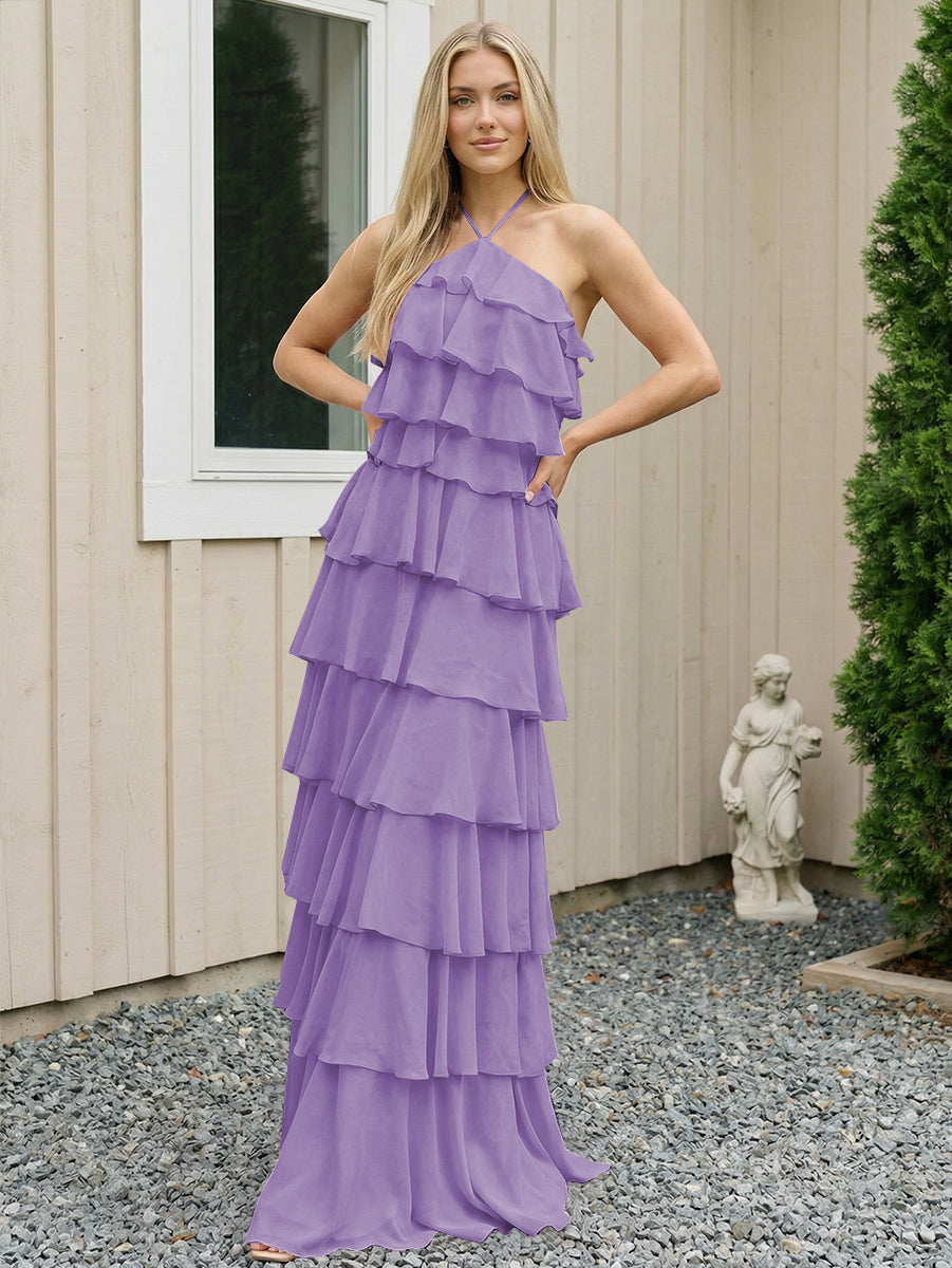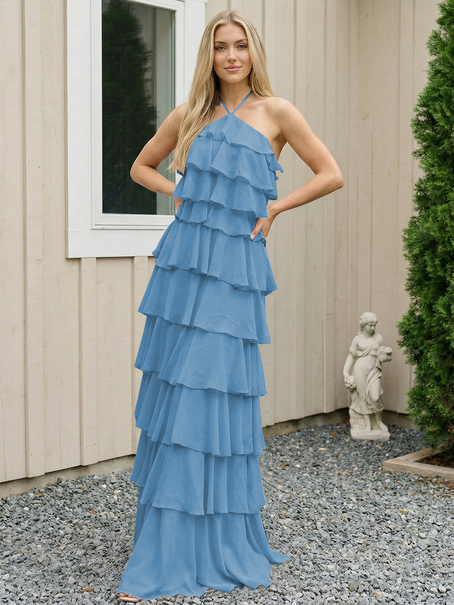 • Chiffon Halter Tiered Maxi Long Bridesmaid Dresses with Backless Design