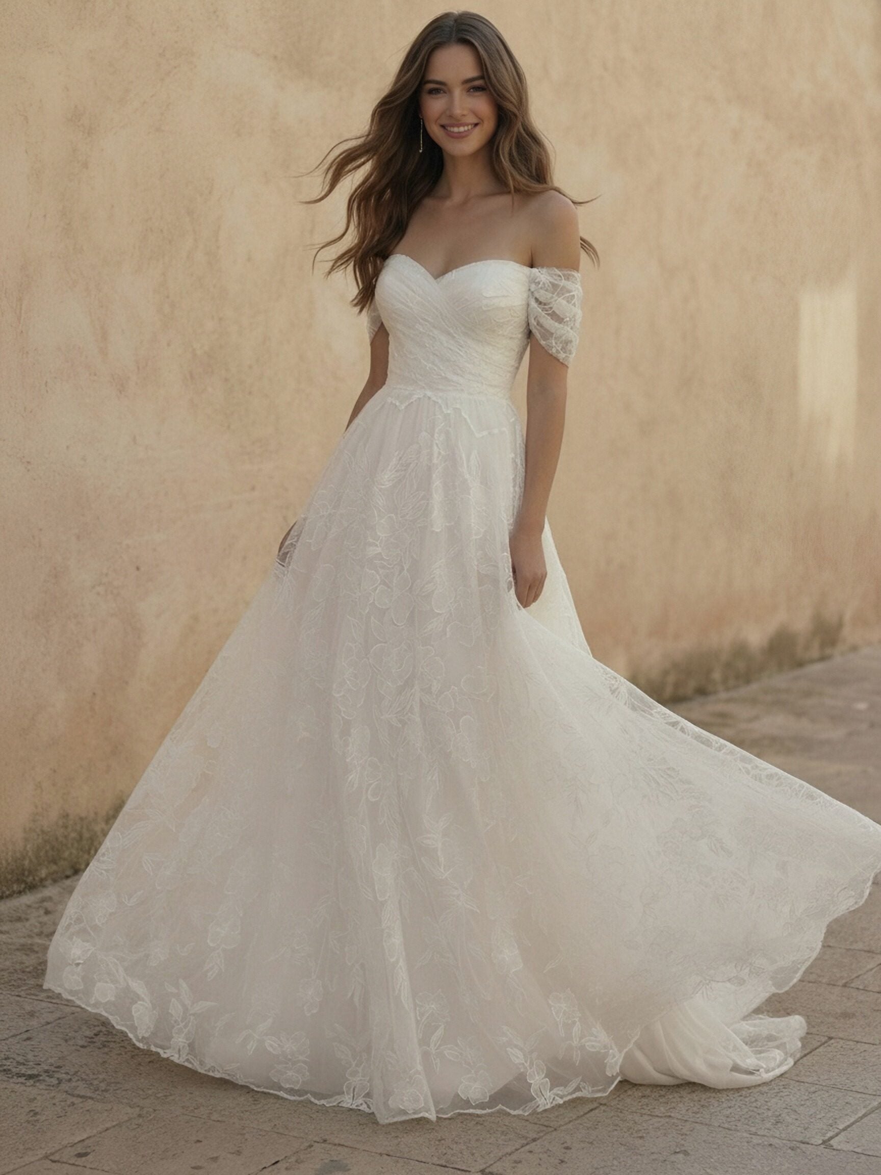 YES1180014 Laces A Line Off the Shoulder Long Wedding Dresses