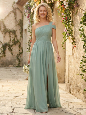 Chiffon One Shoulder Ruched Waist A-Line Maxi Bridesmaid Dresses with Slit