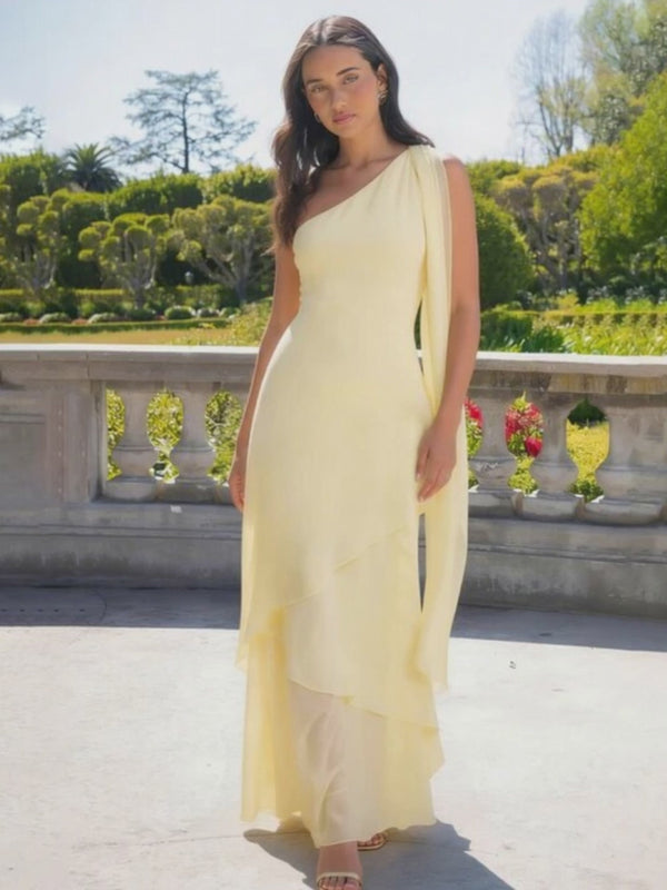 Lightweight Chiffon One Shoulder Ruched Waist Asymmetric Ruffles Maxi Bridesmaid Dresses with Slit
