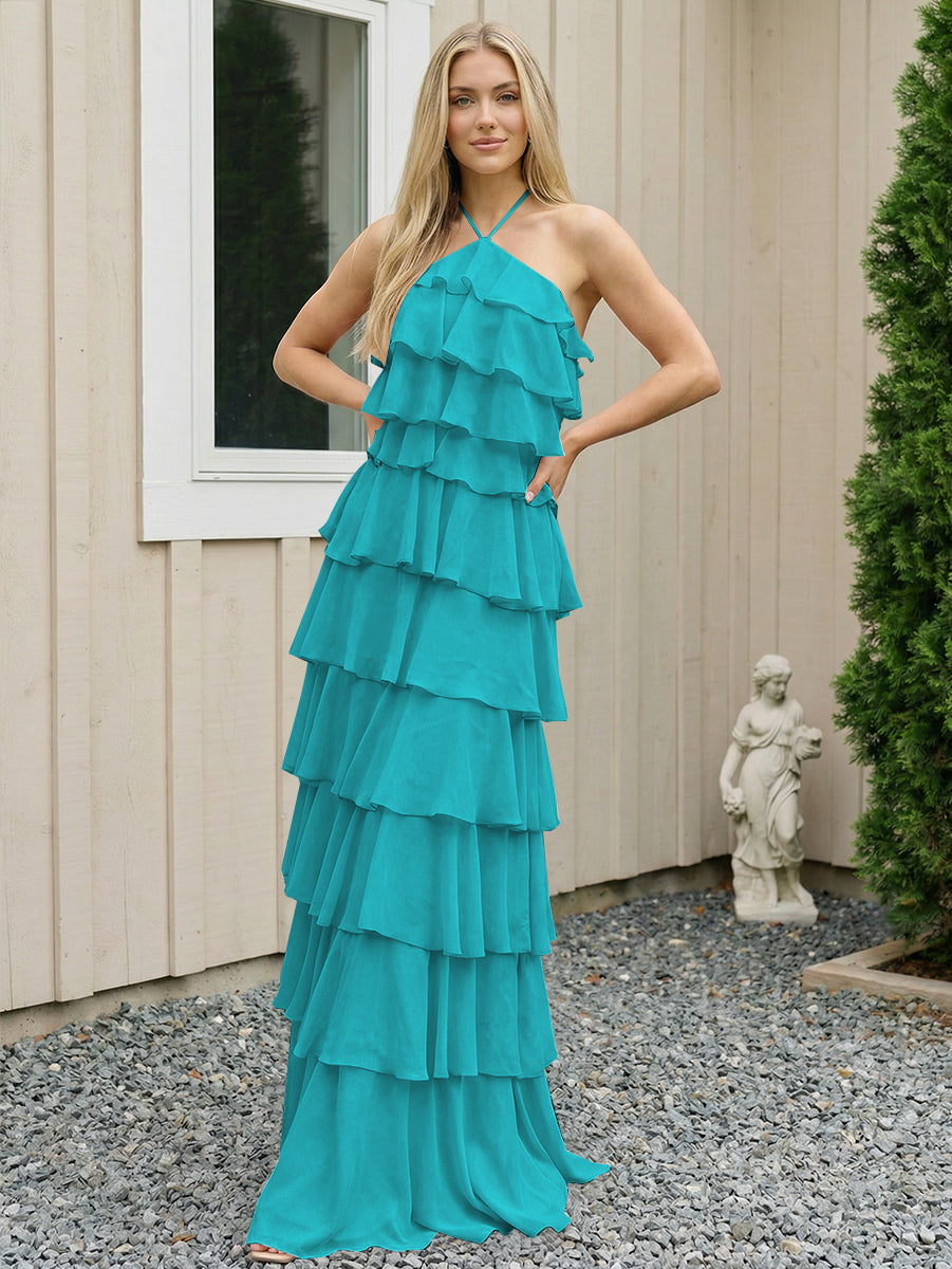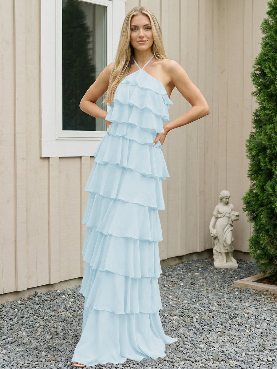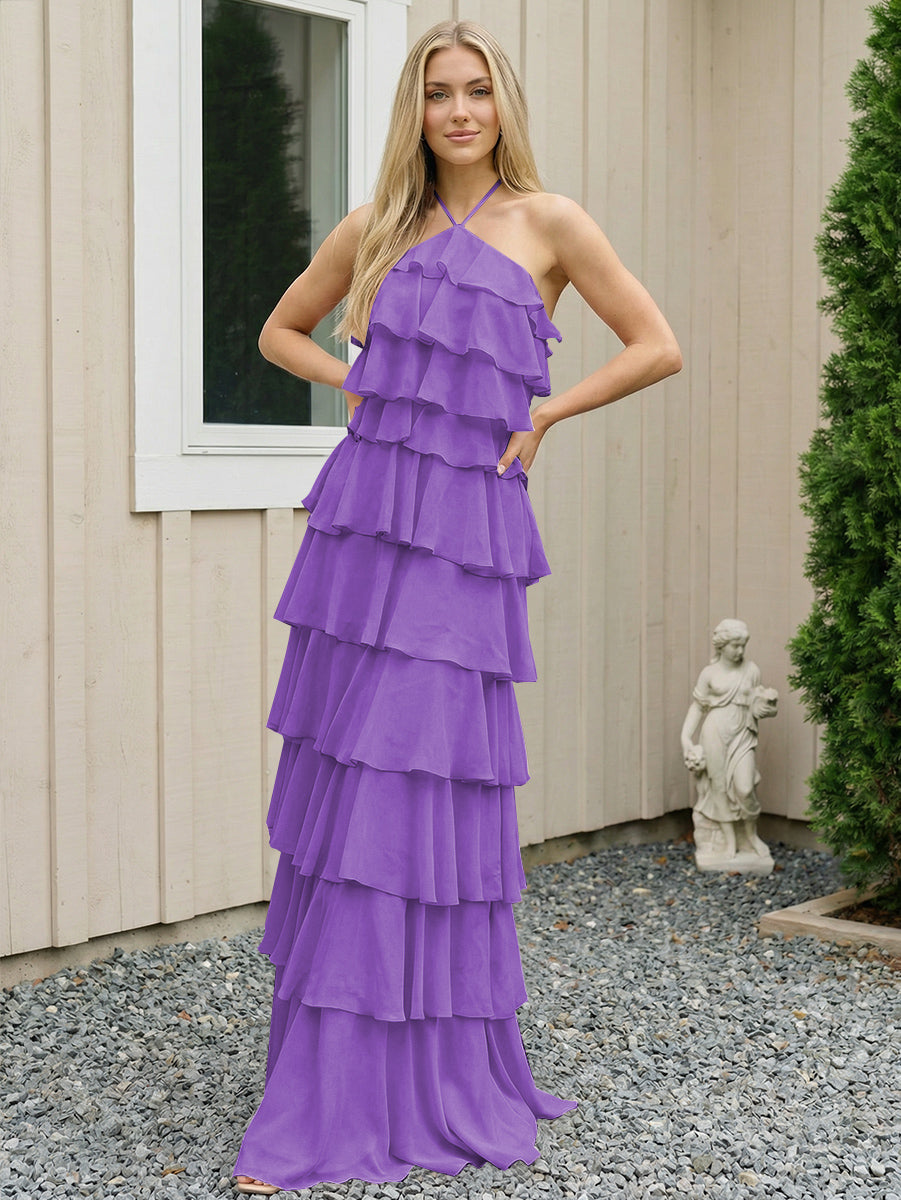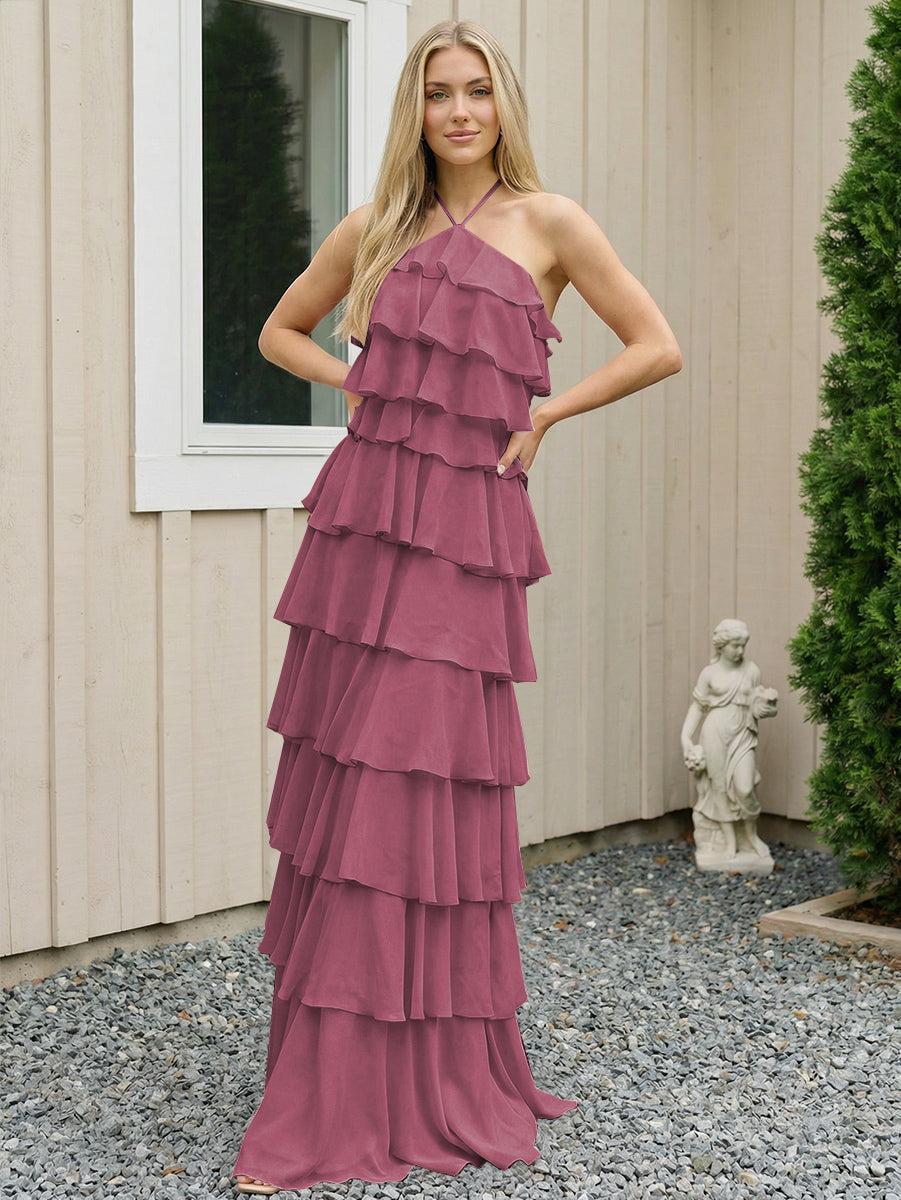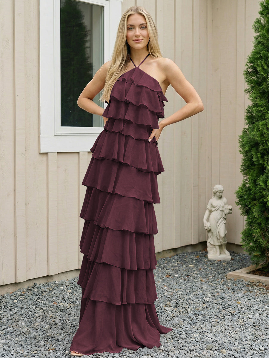 • Chiffon Halter Tiered Maxi Long Bridesmaid Dresses with Backless Design