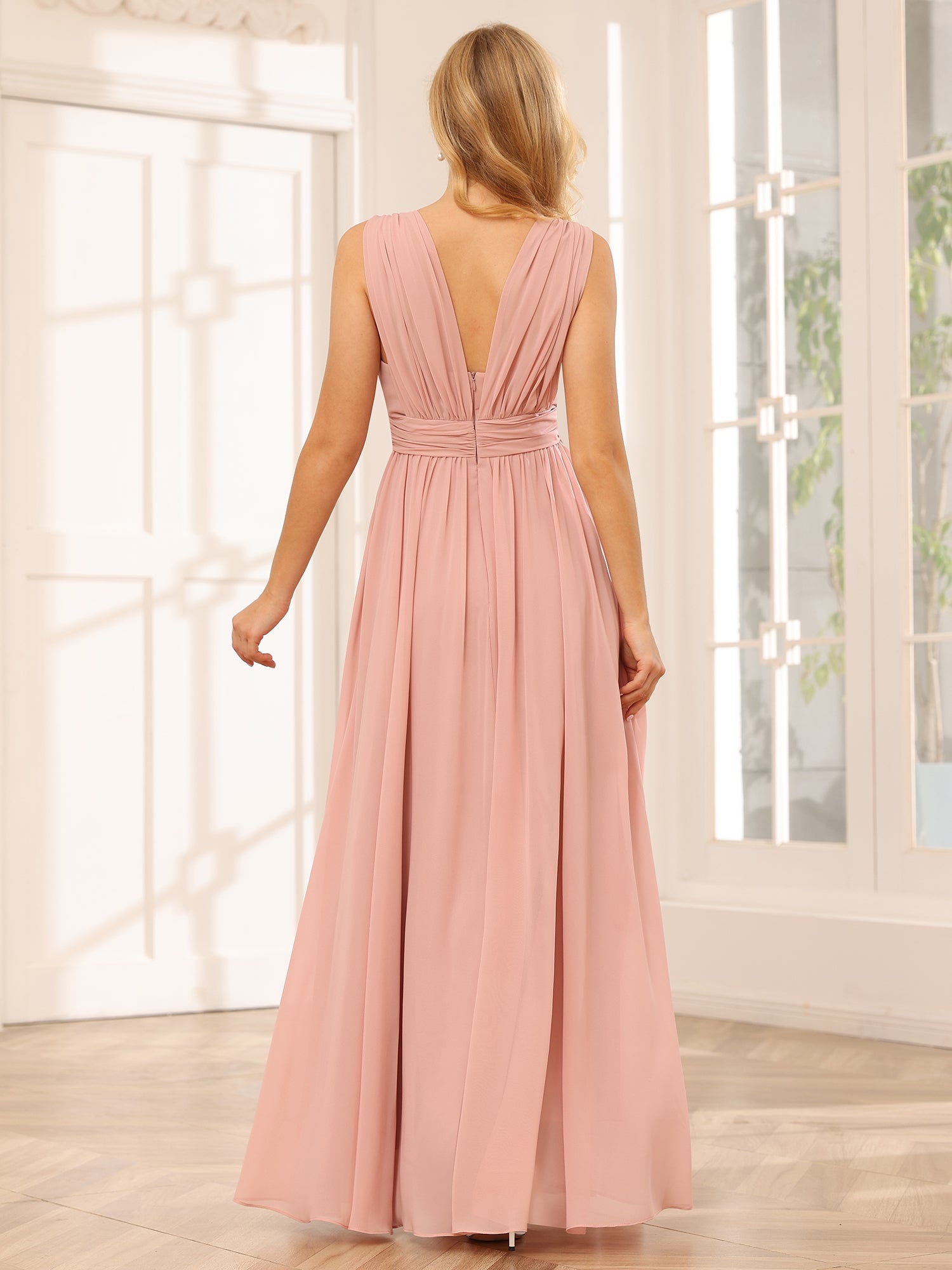 • Chiffon V Neck A Line Pleated Bridesmaid Dresses with Slit