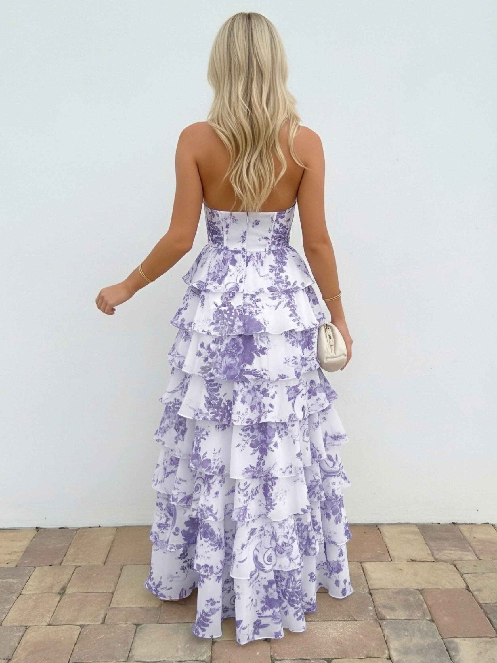 • Halter Floral Deep V Neck A-Line Prom Dresses with Layered