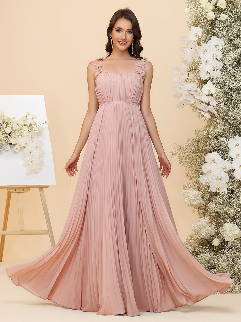 YES1140714 A-Line Chiffon Bridesmaid Dresses - Ruched Bodice & All-Over Accordion Pleated Skirt with 3D Floral Spaghetti Straps