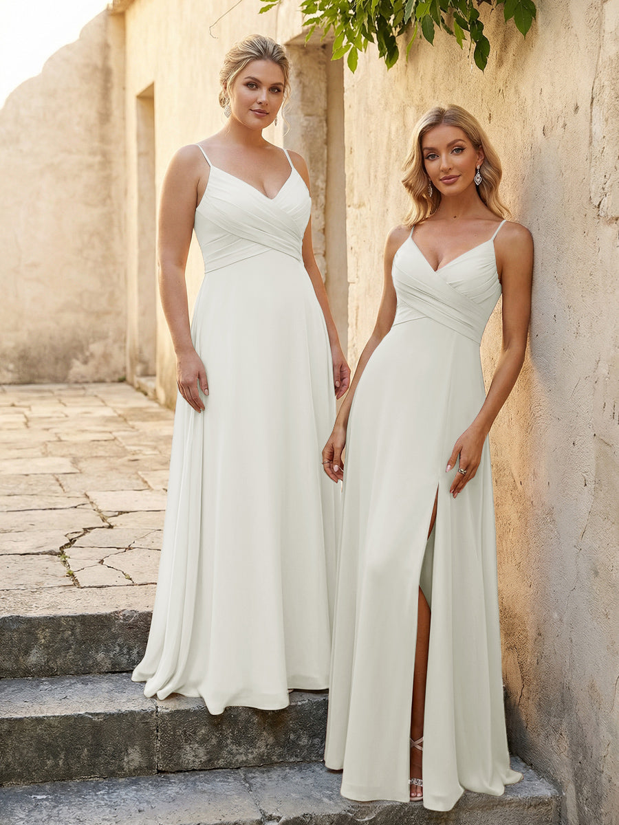 • V Neck Pleated Chiffon Side Slit Bridesmaid Dresses