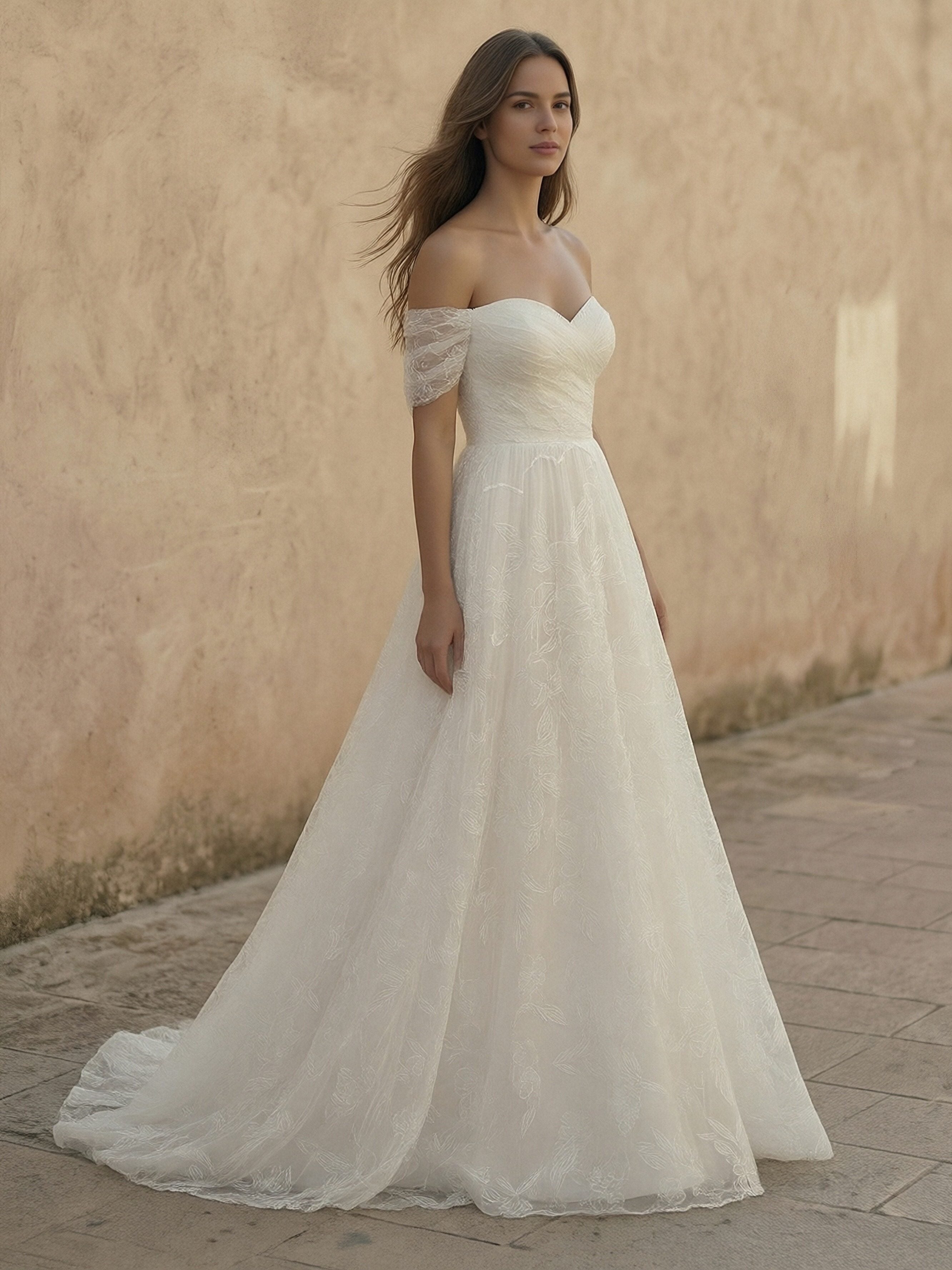 • Laces A Line Off the Shoulder Long Wedding Dresses