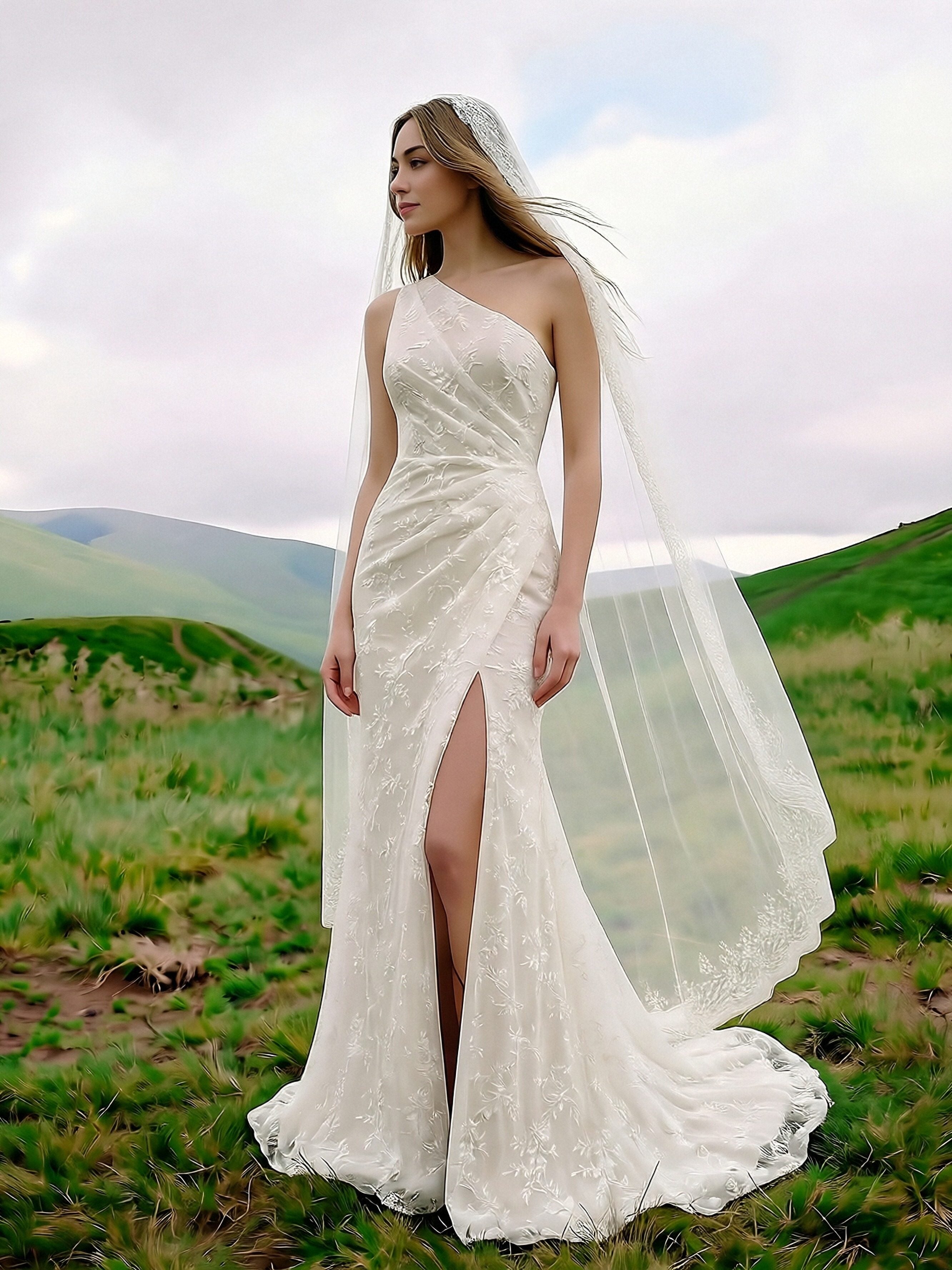 • Laces Mermaid One Shoulder Long Wedding Dresses