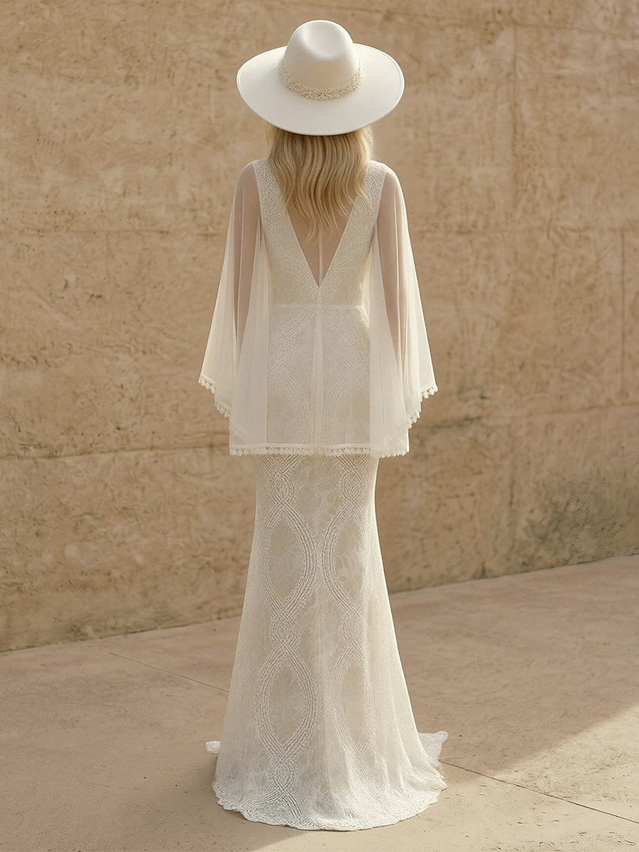 YES1180095 Laces Mermaid V Neck Long Wedding Dresses